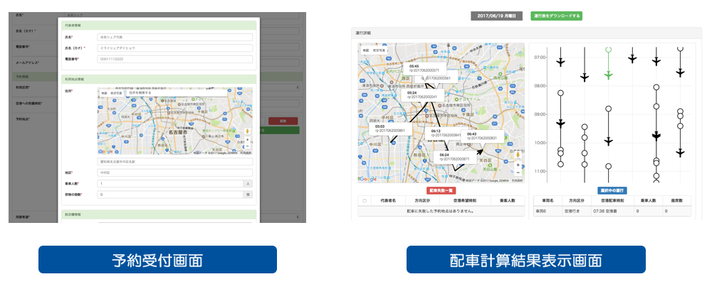 乗合い計算AIシステムでは、乗車位置、空港到着希望時刻の異なる複数のお客様からの予約に対し、最も効率の良い走行ルートとお迎え予想時刻を決定します。同時に、お客様の人数や時間帯に応じて最適な走行車両台数を決定します。 さらに、コールセンタースタッフ向けの予約受付画面や、配車計算結果のビジュアルな表示機能を備え、直感的に運行計画の確認を行うことができます。