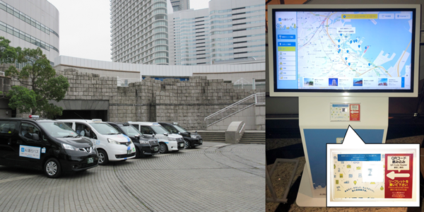 AI運行バス®の車両は、車両側面のAI運行バスのマークが目印です。また、アプリからの配車予約だけでなく、リーフレットのマップを元に、まちかど端末(写真右)をエリア内から探し、リーフレットのQRコードを端末にかざすことで予約することも可能です。代表的な観光エリアを中心に運行しておりますので、ぜひご利用ください。
