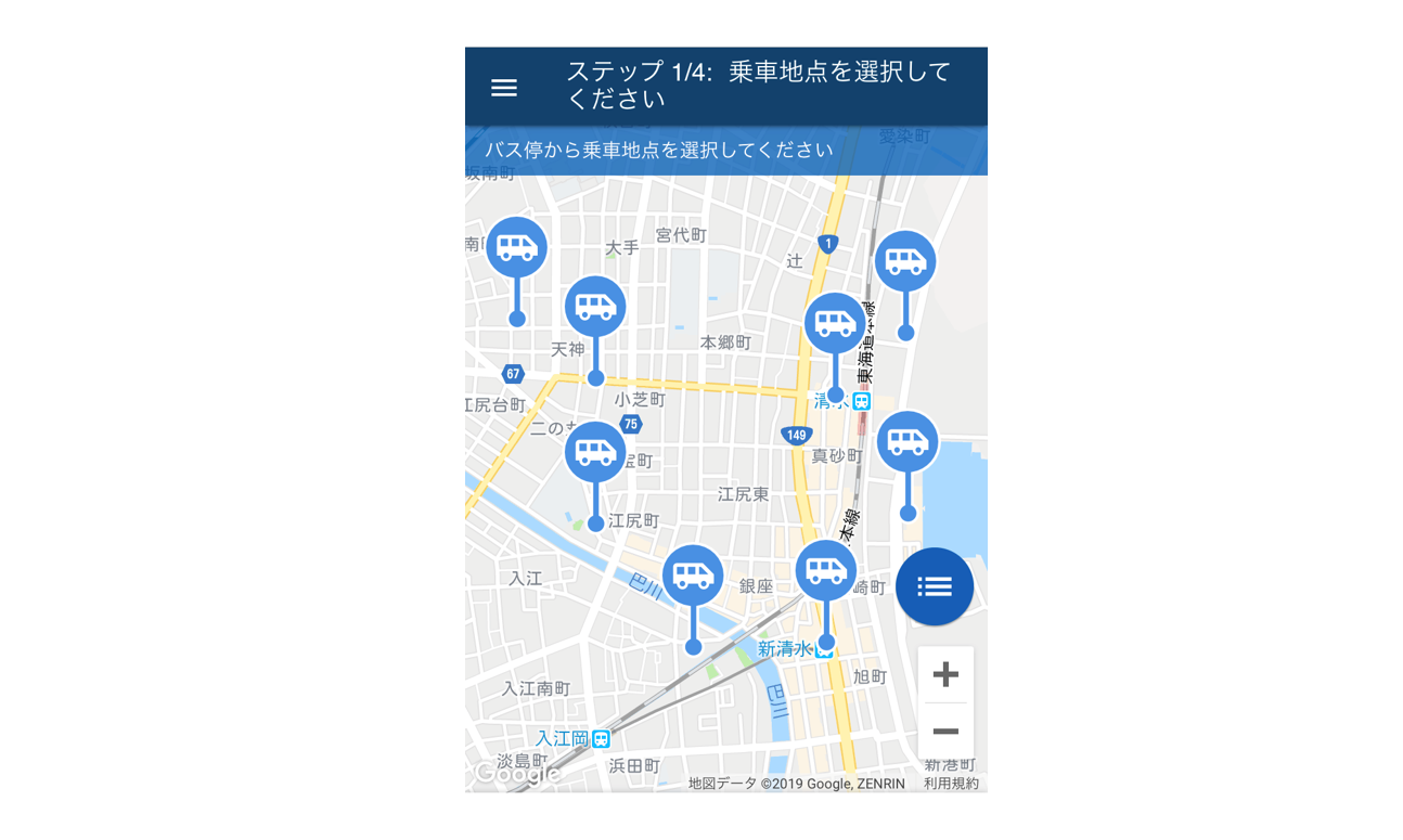 未来シェアは静岡県静岡市にある清水港にてSAVSを活用したクルーズ来訪者向けの実験を株式会社JTB、静岡市、静鉄タクシー株式会社、千代田タクシー株式会社とともに実施いたします。 清水港は静岡県の中心にある港で海の玄関口となっており、周辺には観光施設が数多くあります。またクルーズ船が多く寄港しています。本実証実験日には、クルーズ船である「ダイヤモンドプリンセス号」の寄港が予定されていますが、現在の清水港周辺の交通の現状では観光が難しい状況にあります。そこで、クルーズ来訪者向けにオンデマンド型乗合実証実験を実施し、有用性を検証します。実験では、仮想のバス停を清水港周辺の観光地に設置し(写真)、アプリから予約をしていただくことで、バス停間を自由に行き来することができます。
