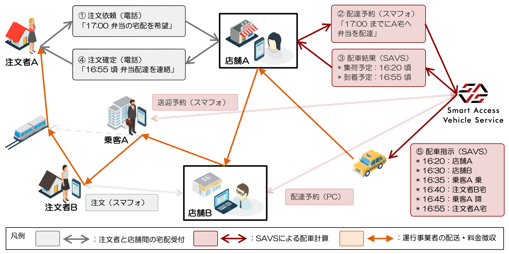 カッピーのりあい号はSAVSによる乗合運行も含めた効率的な地域内公共交通を実現していますが、このプラットフォームの利用範囲を物流まで広げ、人と物、物と物との効率的な送迎と配達へと応用します。