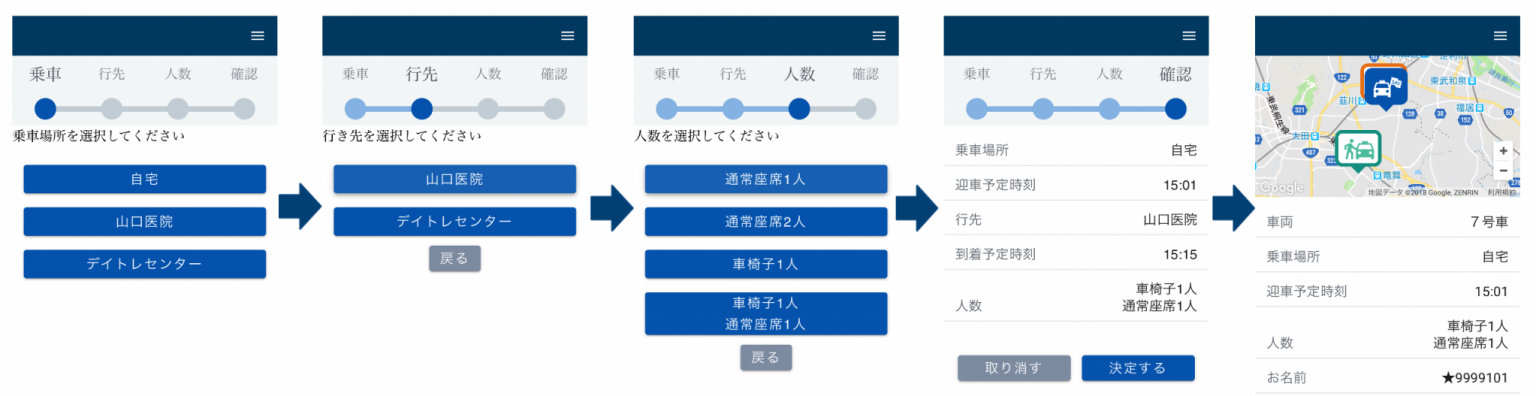 スマートフォンのアプリによる予約は事前に登録された場所と人数の選択による4タップの簡単な操作です