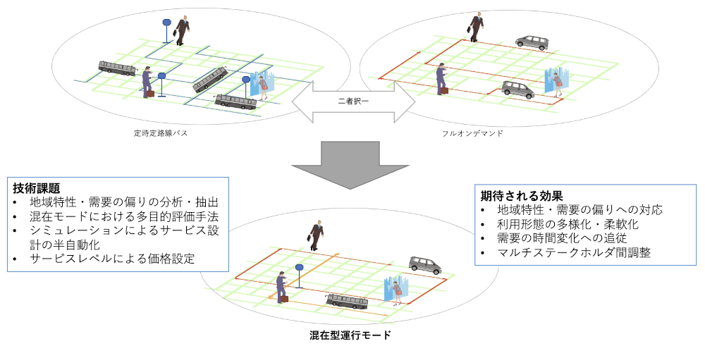 - 複数の運行モードを効果的に即時選択・組み換え・混在可能な配車サービス