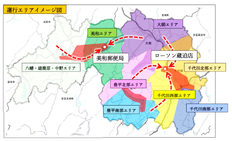 - 運行エリア:北広島町内全域・安芸太田町、安芸高田市、広島市安佐北区安佐町の一部区域