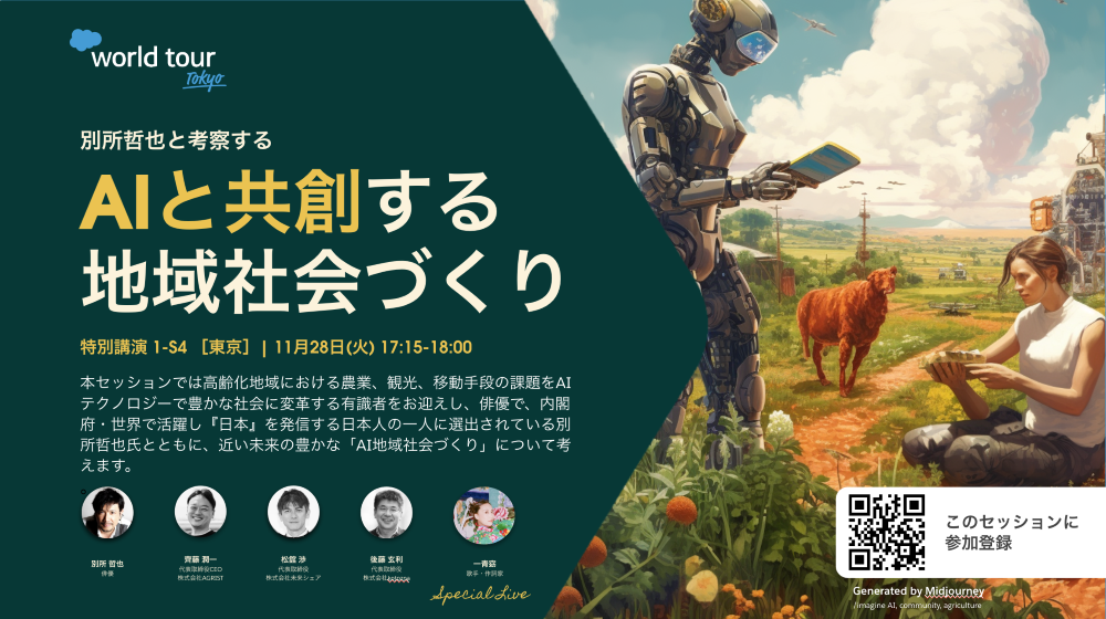 2023年11月28日 (火) – 29日 (水)に開催されるSalesforce World Tour Tokyo の 東京会場 Day1 で行われる特別講演「別所哲也氏と考察〜AIと共創する地域社会づくり」において弊社代表取締役 松舘 渉 が登壇します。本セッションにおいては高齢化地域における農業、観光、移動手段の課題をAIテクノロジーで豊かな社会に変革する有識者と、俳優で観光庁「VISIT JAPAN 大使」でもある別所哲也氏とともに、近い未来の豊かな「AI地域社会づくり」について考えます。会場に加えオンラインでもご視聴いただけますので、ご興味のある方、ぜひご参加ください。