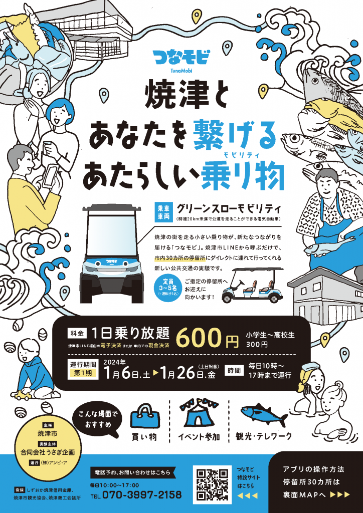 2024年1月6日(土)~3月24日(日)静岡県焼津市にて実施の交流型モビリティ実験「つなモビ」に、AI配車計算サービスSAVSを提供します。本実験は1月6日(土)~1月26日(金)の21日間を焼津市事業、1月27日(土)~3月24日(日)の58日間を経済産業省の事業として実施されるもので、実験初日の1月6日(土)は、焼津市役所にて午前9時45分~10時まで、出発式セレモニーを行い、先着順で同日限り有効の無料試乗チケットをお渡しする予定です。