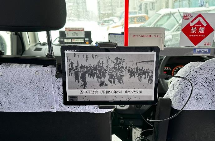 タクシーの車内に設置されたディスプレイには、タクシーの位置情報にもとづいて地域活動の情報やかつてのもみじ台地区の懐かしい写真等がリアルタイムで展開されます。このディスプレイを通じた情報提示が、同乗者同士のコミュニケーションを促進し、車内が気軽な交流の場となることで、タクシー利用者の主観的健康観を高めることを期待しています。