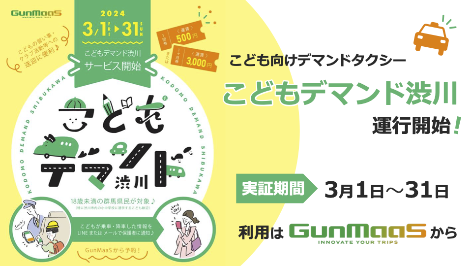 令和6年3月1日(金) ~ 令和6年3月31日(日)まで、「デジタル田園都市国家構想交付金デジタル実装タイプ2」を活用し、群馬県が渋川市及び関係事業者との連携により、児童・生徒をを対象としたデマンドタクシーサービス「こどもデマンド渋川」を開始します。