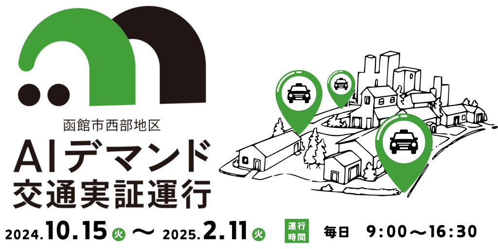 令和6年10月から令和7年2月まで、北海道函館市⻄部地区でAIデマンド交通実証運⾏事業が実施されます。
