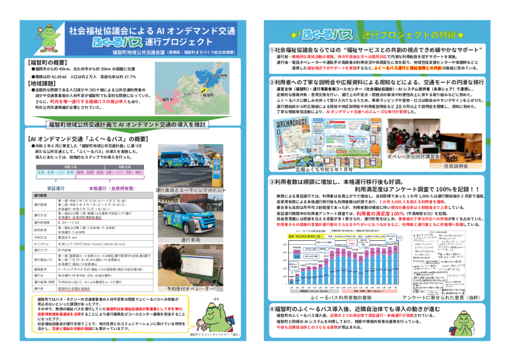 - 日本モビリティ・マネジメント会議(JCOMM):令和6年度JCOMM賞の受賞者:社会福祉協議会によるAIオンデマンド交通「ふく~るバス」運行プロジェクト