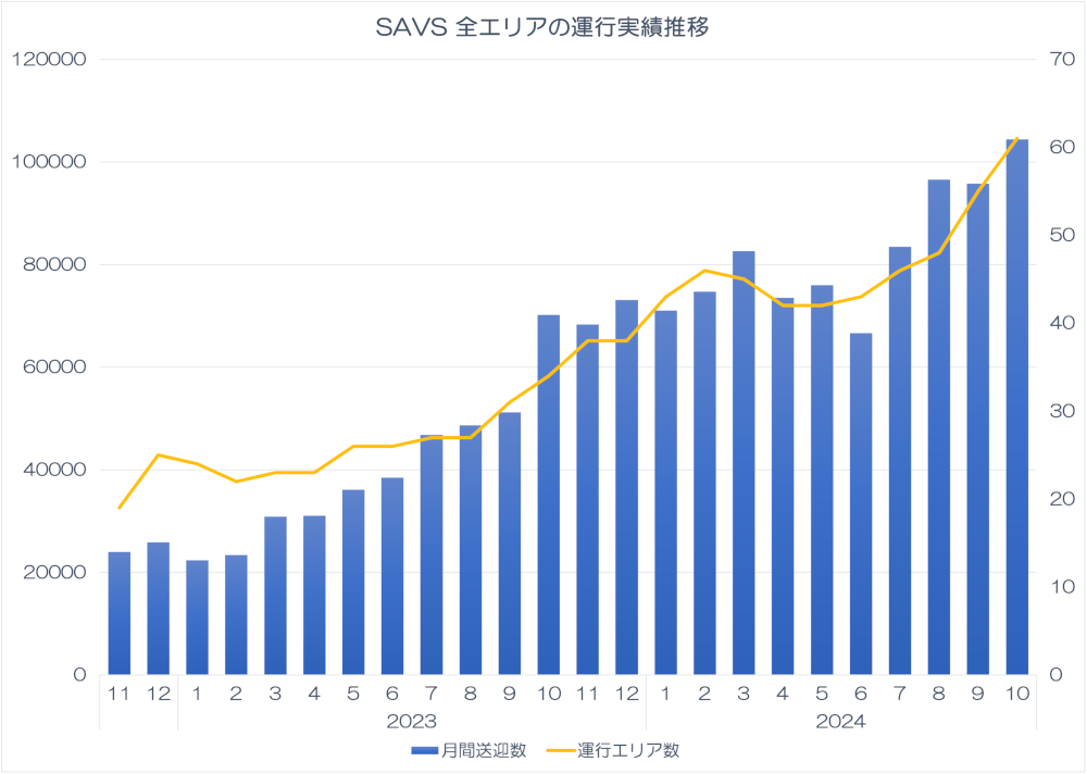 オンデマンド交通やタクシー配車、デマンドバス、物流計画作成、貨客混載運行等、モビリティサービスへの SAVS の実運用導入件数が50を超えました。実証実験運行は100エリア以上、月間の延べ送迎数は100,000に達しました。