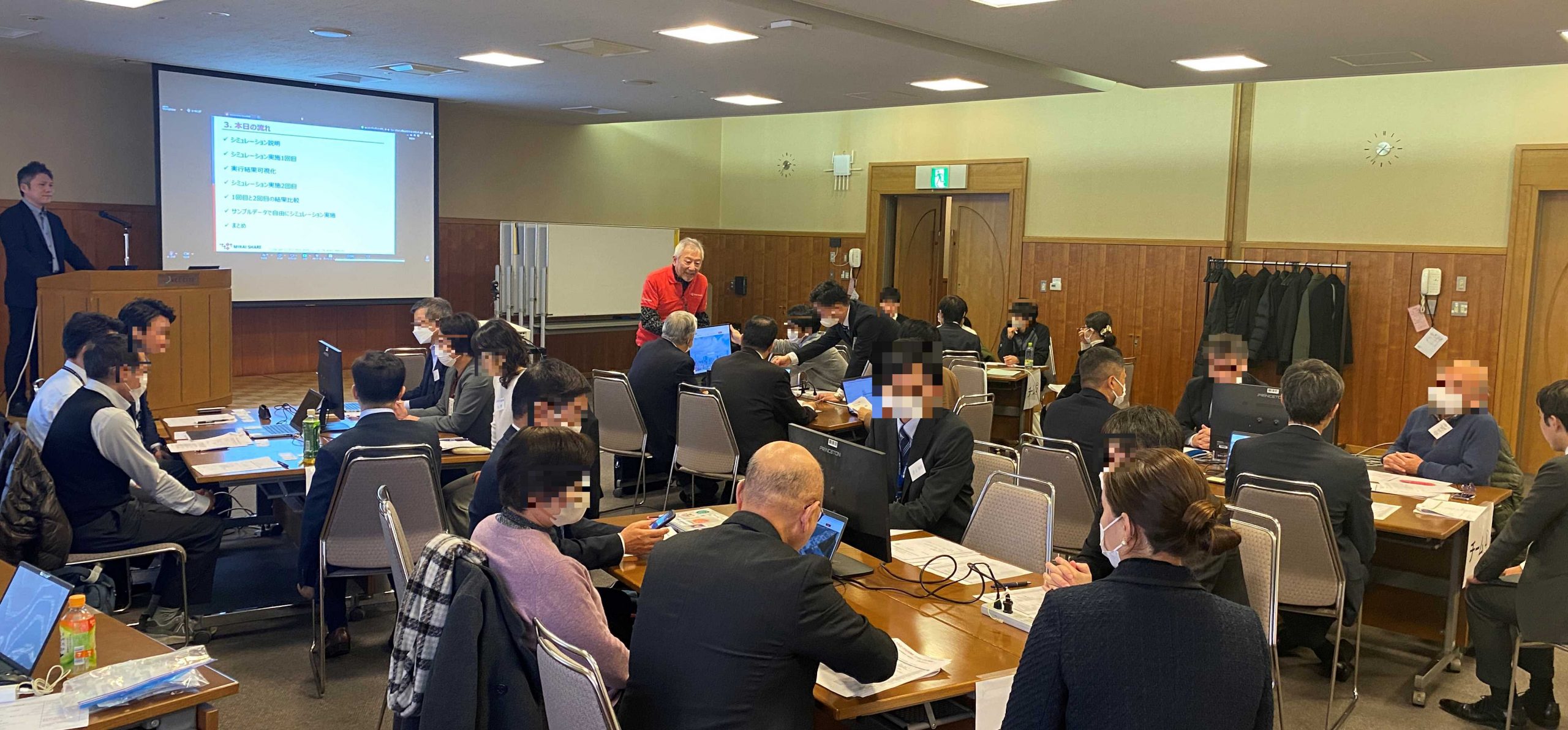 静岡県内の行政職員、交通系事業者をはじめ、現地会場は23名、オンラインは13名の方に参加いただきました。内容は、マルチエージェントシミュレーションの原理から、未来シェアが提供しているSAVSオペレーションシミュレータ (SAVSOS) を使った演習までを含み、未来シェアからは4名が講師と演習アシスタントを務めました。
