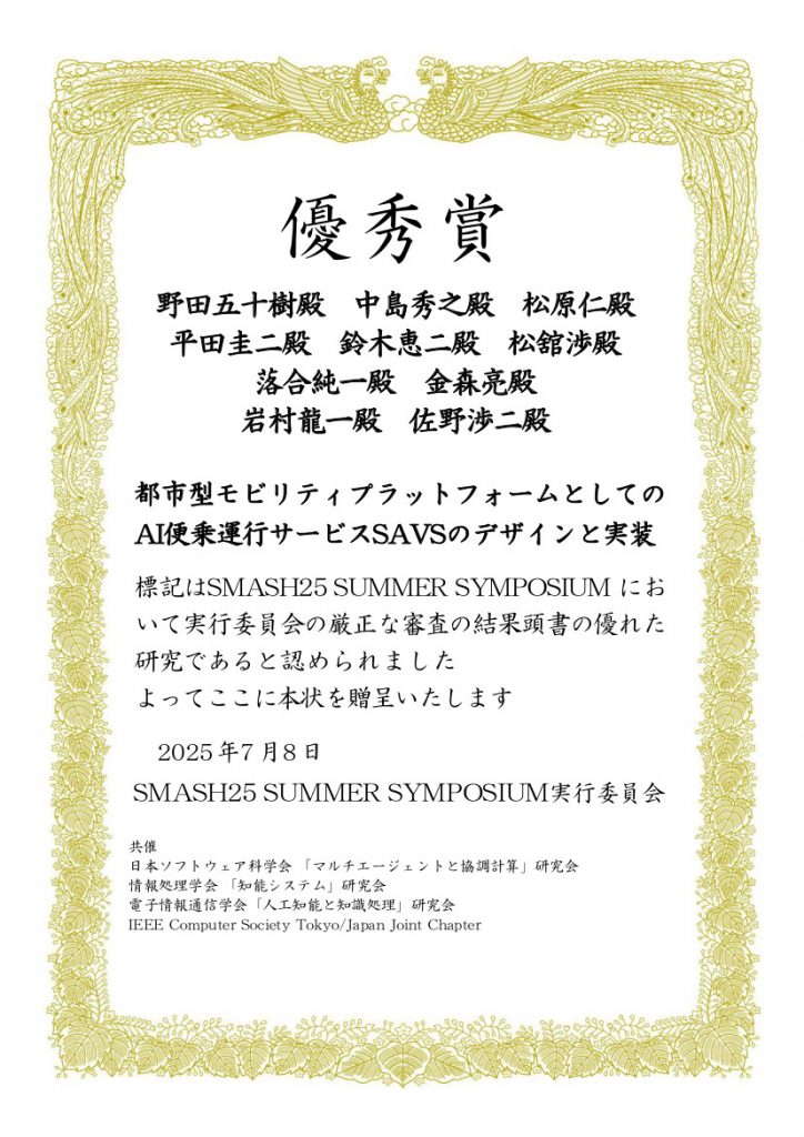 第11回目の開催となる SMASH (Symposium on Multi Agent Systems for Harmonization) にて発表したテーマ「都市型モビリティプラットフォームとしてのAI便乗運行サービスSAVSのデザインと実装」が優秀賞を受賞しました。
