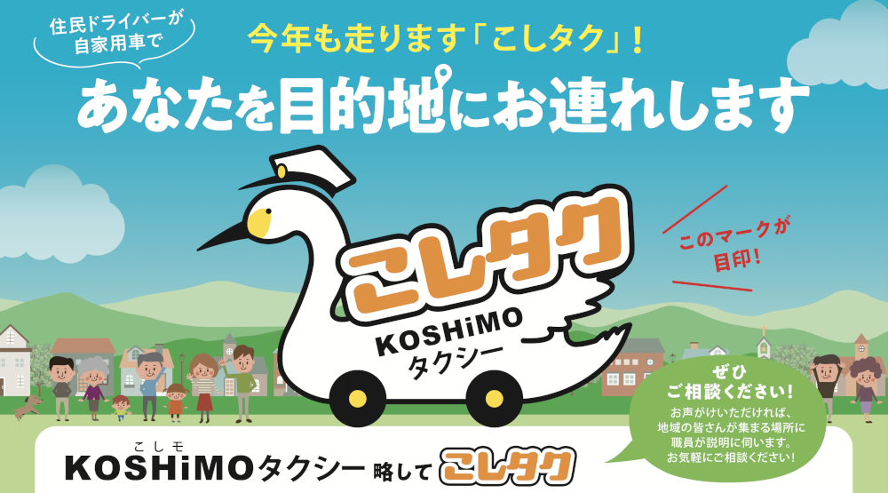 令和7年8月18日(月) より、北海道小清水町にて、SAVS を活用した地域交通実証事業「KOSHiMOタクシー(こしもタクシー)」略して「こしタク」の運行を開始します。昨年度に引き続き、小清水町の住民が自家用車を使いドライバーとして送迎するサービスで、住民自らが地域交通を支えることにより、地域の課題である運転手の担い手不足の解消を目指します。