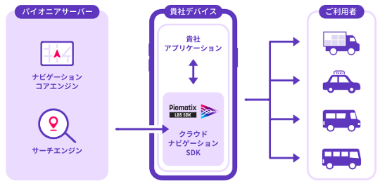 パイオニア株式会社が提供する「Piomatix(パイオマティクス) LBS SDK」 を SAVS ドライバーアプリへ組み込みました。高精度な音声案内付きナビゲーションをオプションサービスとして利用することができます。