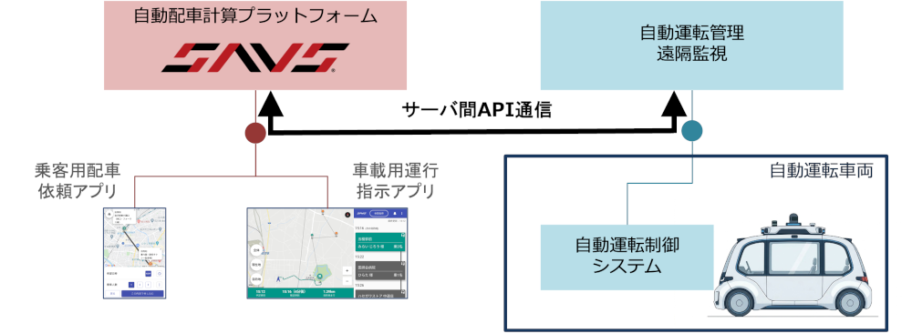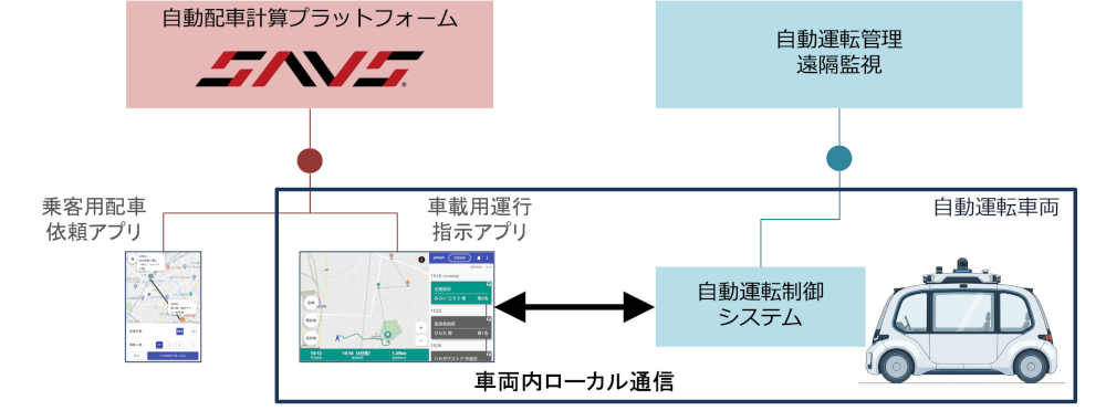 今回の取り組みでは、株式会社エクセイド社との共同により上記②の開発を進め、SAVSのドライバーアプリとエクセイド社の自動運転制御システム(ADENU)を車両内ローカル通信にて連携させました。この対応により、インターネット通信が不安定な状況下においても、運行指示アプリと自動運転制御システムが安定的に遅延なく連携し続けることができます。