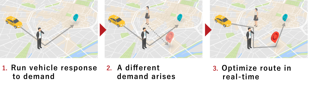 Based on people’s travel demands and the operation status of all vehicles, the AI judges the most efficient vehicle dispatch and automatically sends a pick-up order to the driver. By means of real-time vehicle dispatch determination that allows for passengers to share rides, vehicle dispatch requests from new passengers can be responded to even while transporting other passengers. SAVS enables us to reduce the number of passenger-less vehicles and draw out optimum transportation efficiency with a limited number of vehicles.