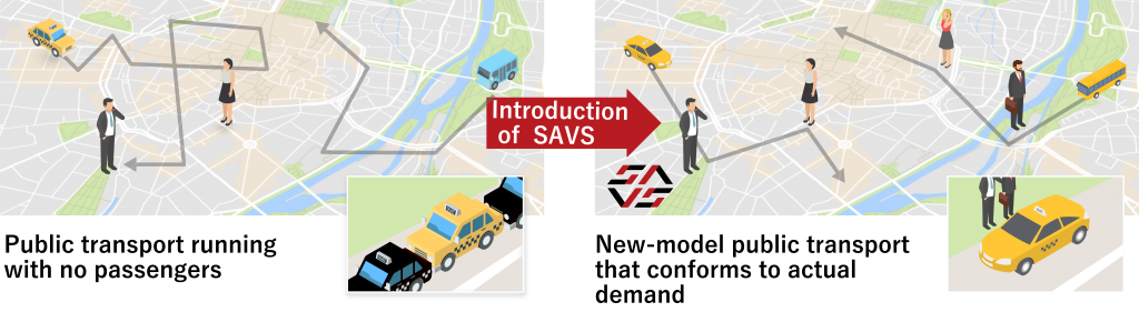 SAVS is a service that that combines the advantages of taxis (on-demand transportation) and fixed route buses (ride-share transportation) and carries out real-time ridesharing vehicle dispatch calculation, by AI. The cloud-based AI platform communicates with smart devices, and, in the constantly changing movement situation of vehicles and people, instantaneously decides vehicle running routes that simultaneously fulfil all spatial movement and desired times. By this technology, we realize optimum transportation at city level.