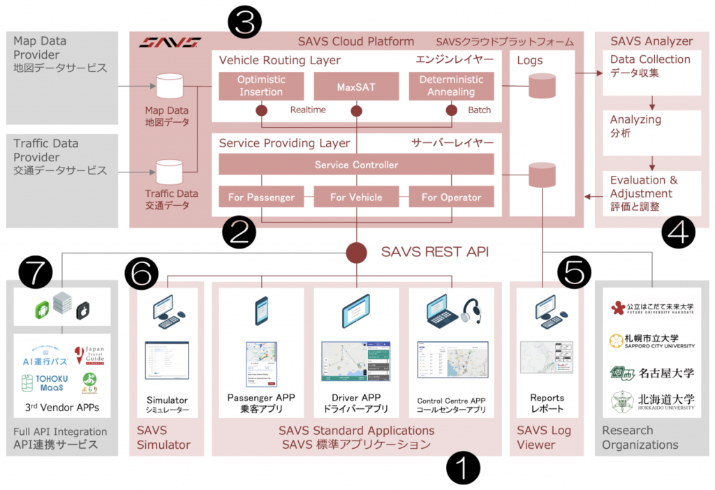 SAVS の運行により蓄積されたログ・データを使用し、AI分析ツールによる評価と各種パラメータの最適値を探ります。分析結果をSAVS クラウドプラットフォームへフィードバックすることにより、各運行地域、環境において適切な配車パラメータを用いた運行を実現します。