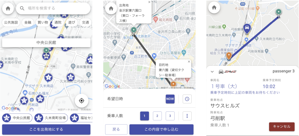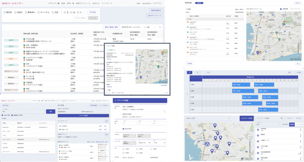 スマートフォンに最適化された乗客向けのWebアプリケーションです。乗車位置、降車位置、人数、希望時刻などの情報を送信すると、瞬時に車両情報、予定乗車時刻などの配車結果が通知されます。配車確定後は、担当車両の現在位置を地図上で確認することができます。 LINE IDと連携することにより、SAVS 専用の ID/PW を作成せずともご利用することができます。