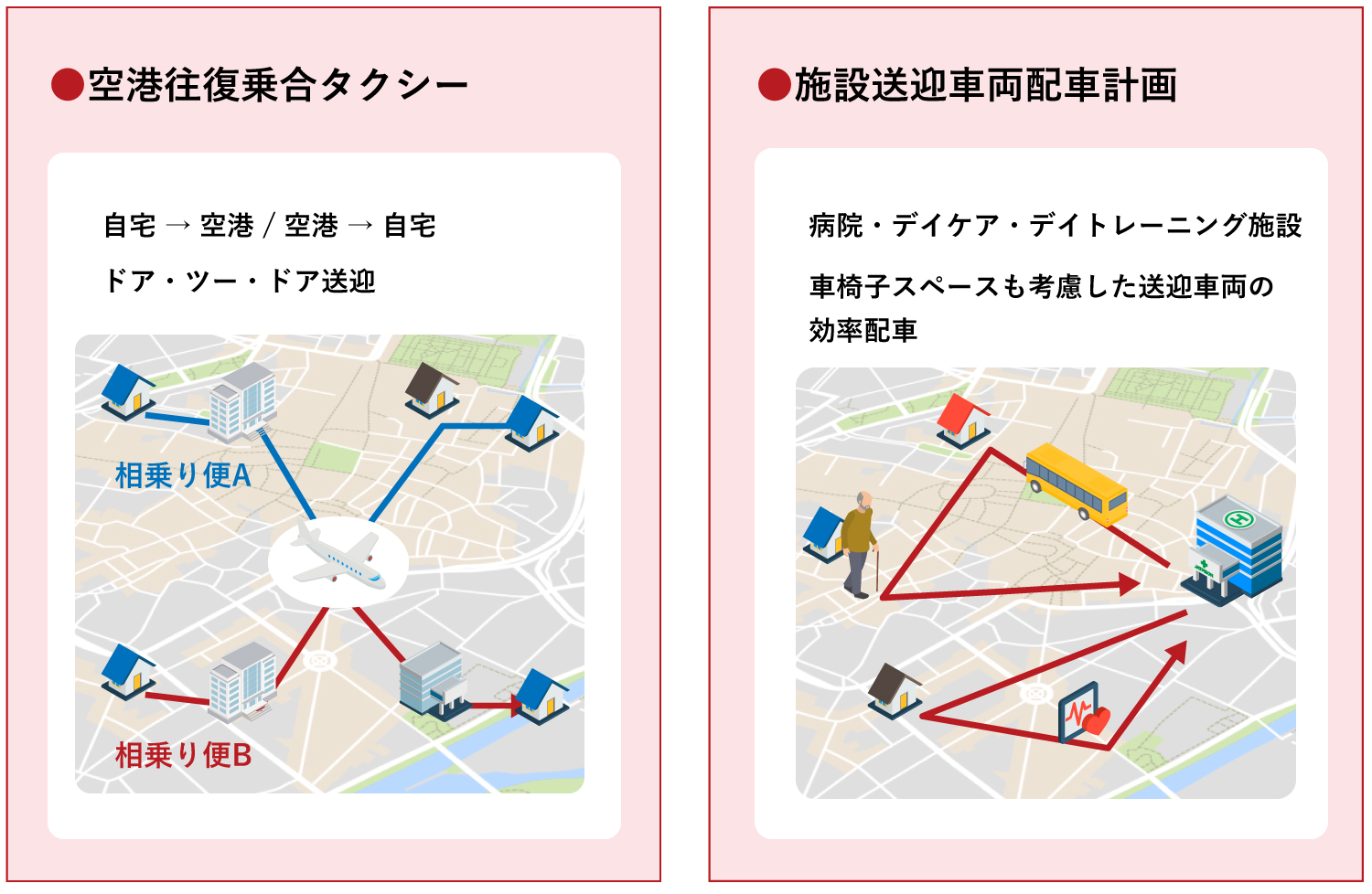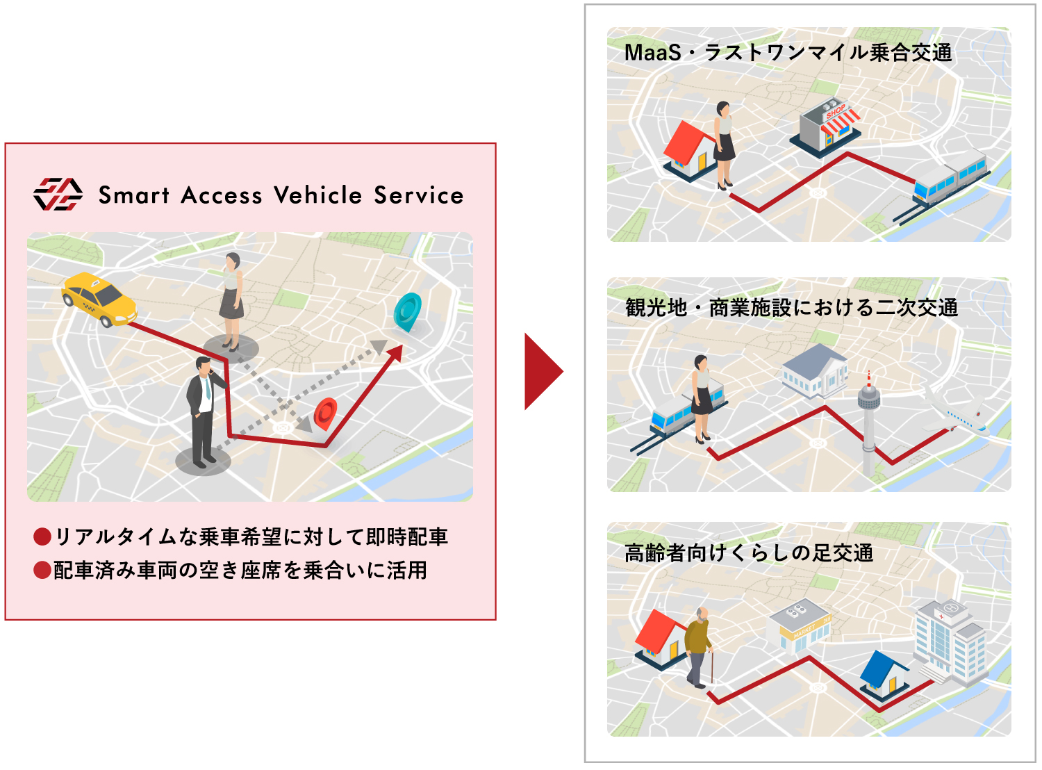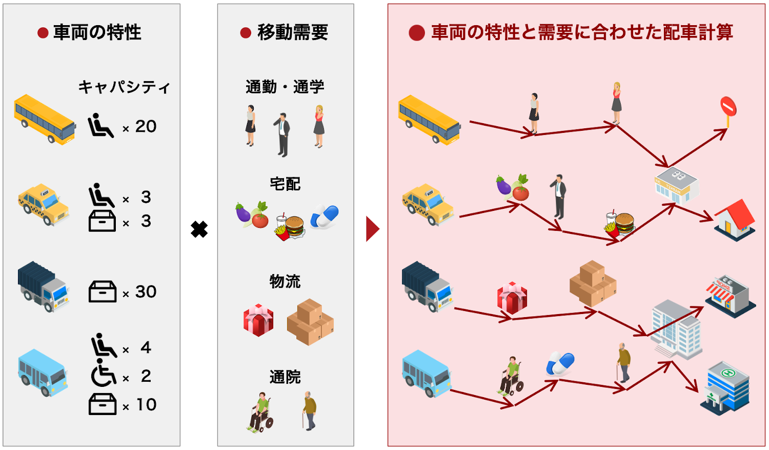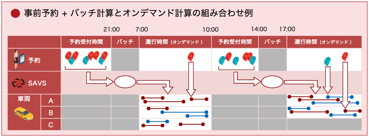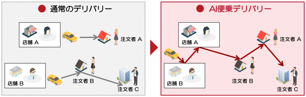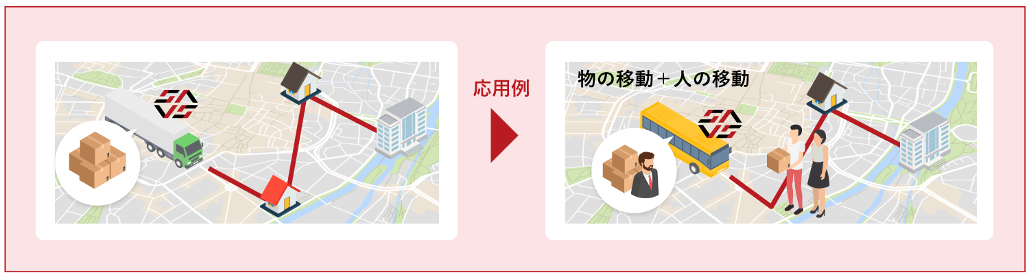 また、人が乗車中の車両へ荷物を便乗させたり、配送中の物流車両で人を移動させるなどの貨客混載運行、車椅子リフト付き車両の便乗配車にも応用可能です。