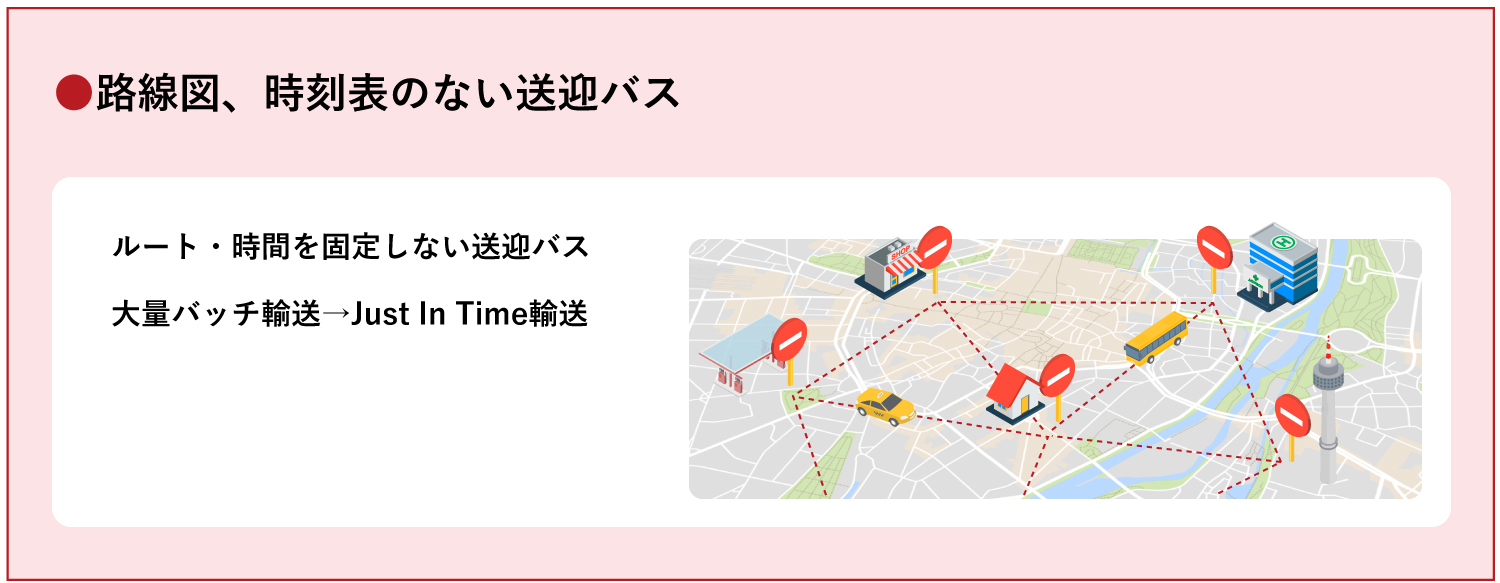 定時・定路線の送迎バス、路線バス運行に代え、路線図、時刻表のないオンデマンドによる Just in Time 乗合バス運行サービスとしてご利用いただけます。