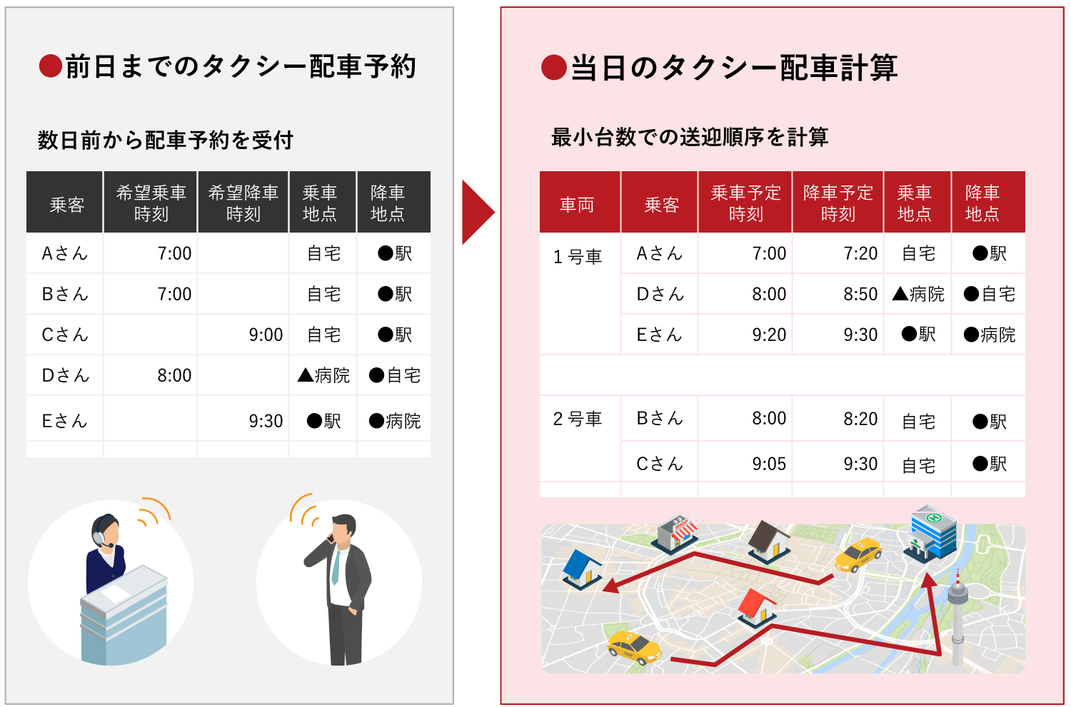 前日までの配車予約を元に、タクシーの送迎計画を作成します。最小台数のタクシーで最大効率の送迎を実現します。