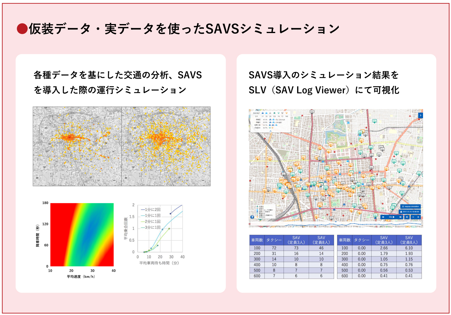 クラウド型 SAVS オペレーション シミュレーターの利用により、いつでも何度でも各種運行条件に対する網羅的、再帰的シミュレーションを実行することができます。デマンド交通計画の策定、効果的な配車パラメータの調整検討に役立つツールをご提供します。