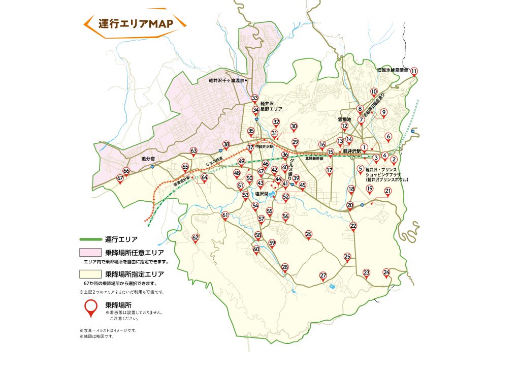 9:00~19:00 ※予約時間は当日の8:00~18:30 - 運行エリア:軽井沢町内(一部エリアを除く) ※エリアにより乗降場所指定方法が異なります