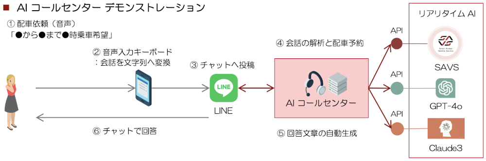 この特徴を活かし、技術進歩が著しい対話型 AI をユーザインタフェースとして使用、さらにスマートフォン標準の音声入力キーボード、LINEチャットを組み合わせることにより、公開動画のような対話型の AI コールセンターを構築することが可能となります。