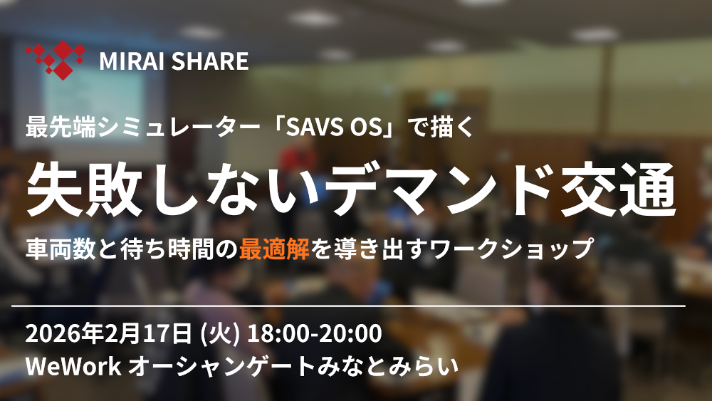 - イベント名:最先端シミュレーター「SAVS OS」で描く失敗しないデマンド交通 -車両数と待ち時間の最適解を導き出すワークショップ-