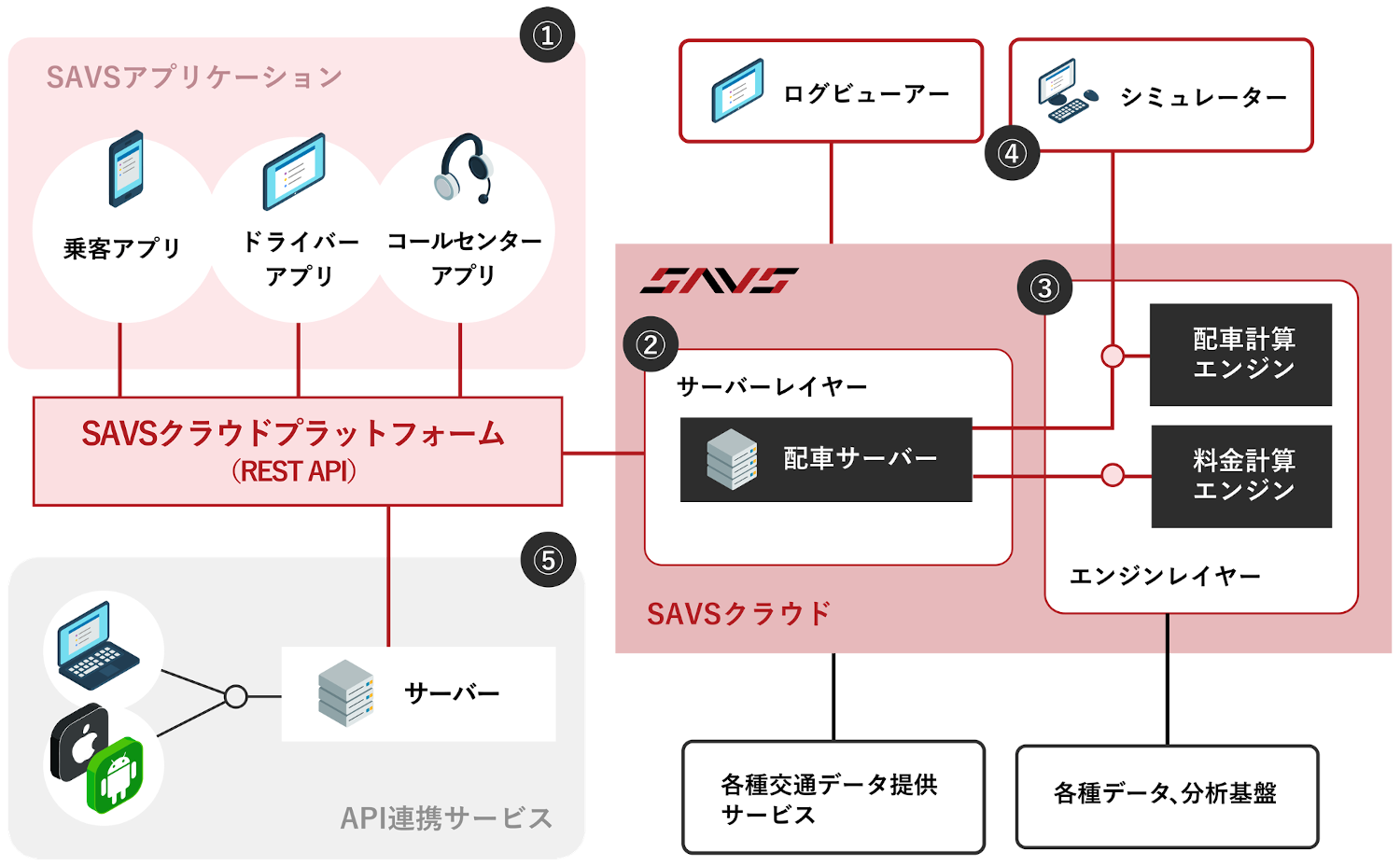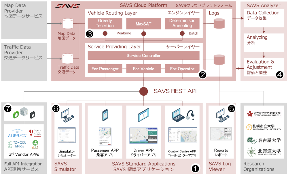 SAVS クラウドプラットフォームの機能は全て標準的な REST API にて提供されます。必要なAPIを手順に従って利用することにより、独自のアプリケーションや IoTデバイスに SAVS を組み込むことができます。MaaSアプリ、観光アプリ、配送システムなど、AI配車と組み合わせた様々なサービスを構築することができます。