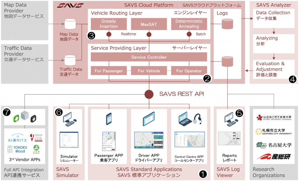 SAVS の運行により蓄積されたログ・データを使用し、AI分析ツールによる評価と各種パラメータの最適値を探ります。分析結果をSAVS クラウドプラットフォームへフィードバックすることにより、各運行地域、環境において適切な配車パラメータを用いた運行を実現します。