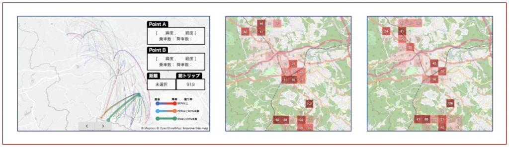 - PT調査データ、タクシー配車データ等を元にしたシミュレーション評価