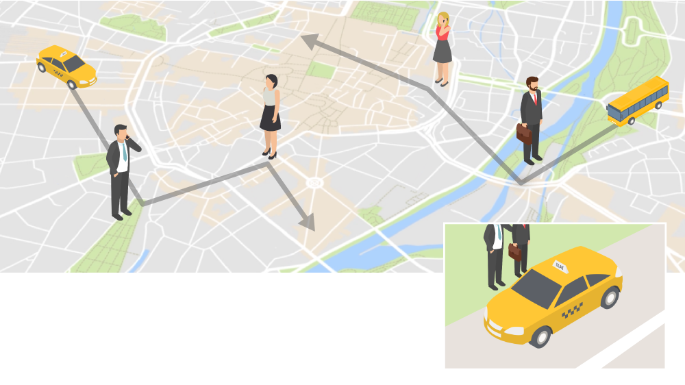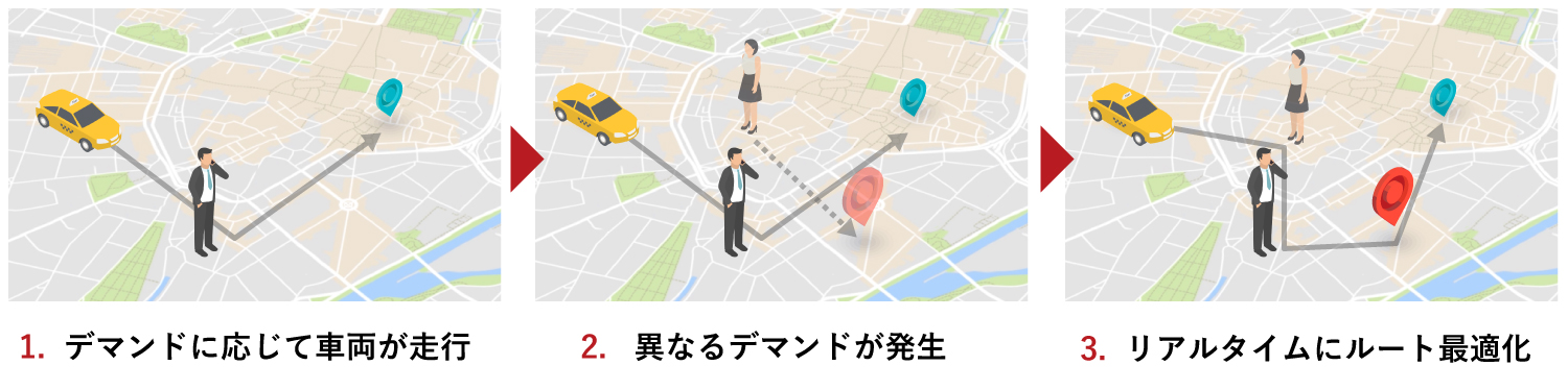 人々の移動要求とすべての車両の運行状況に基づき、最も効率的な配車をAIが判断し、自動的にドライバーへ送迎指示を出します。乗客同士が乗り合うことを許容したリアルタイムな配車決定により、乗客送迎中においても新たな乗客の配車要求に応えることができます。SAVSにより、空車率を減らし限られた車両数で最大限の輸送効率を引き出すことができるようになります。