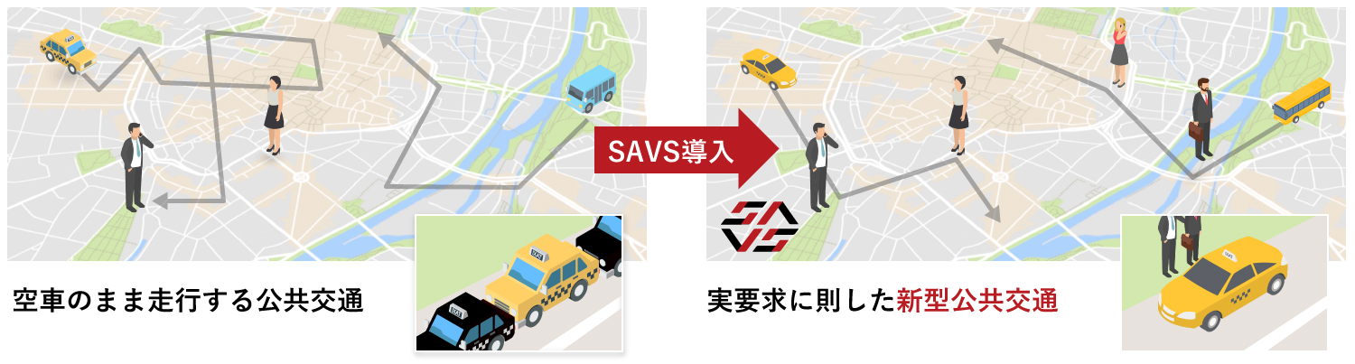 SAVSとは、タクシー(デマンド交通)と路線バス(乗合交通)の長所を掛け合わせた、AIによるリアルタイムな便乗配車計算を行うサービスです。クラウド上のAIプラットフォームがスマートデバイスと通信し、刻々と変化する車両と人・物の移動状況において、全ての空間移動と希望時間を同時に満たす車両の走行ルートを瞬時に決定します。この技術により、都市レベルでの最適交通を実現します。