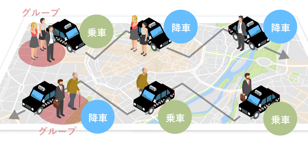 通常のタクシー事業では乗合事業が許可されていませんが、旅客が事前にグループを作ってタクシーに乗り、それぞれ別々に降りることはできます。グループでタクシーに一緒に乗ることを「相乗りする」と言います。